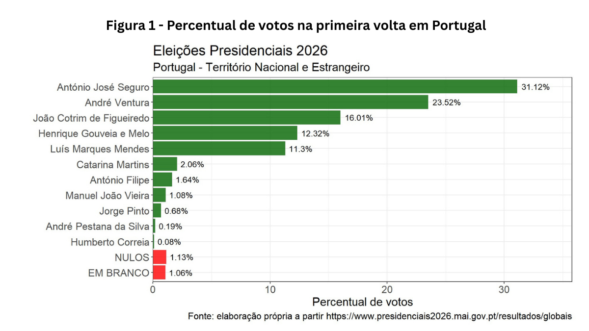 A última eleição presidencial portuguesa decidida na segunda volta foi disputada em 1986 entre Diogo Freitas do Amaral, do então Partido do Centro Democrático Social (CDS) e Mário Soares do Partido Socialista (PS). Na primeira volta, o placar foi folgado e Amaral liderou com 46,31% dos votos válidos contra 25,43% de Soares. Na segunda volta, no entanto, Soares, em uma virada espetacular, saiu vitorioso com 51,18%. 40 anos depois a história se repete e os portugueses voltarão às urnas no dia 8 de fevereiro de 2026 para escolher o novo Presidente da República. A Figura 1 ilustra o percentual de votos dos candidatos durante a primeira volta.