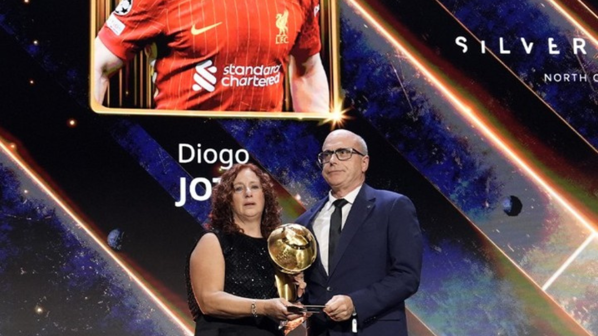O prémio foi entregue pelo agente do jogador, Jorge Mendes, aos pais de Diogo Jota, num momento que levou toda a plateia a levantar-se e a aplaudir longamente.