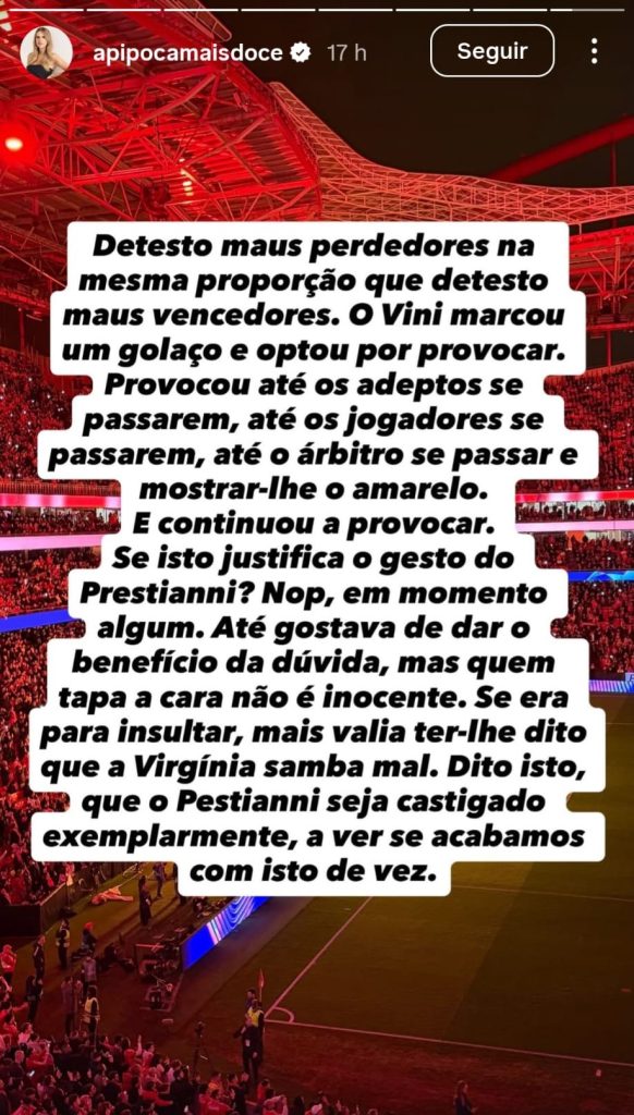 A influencer de 45 anos, que assistiu ao jogo de ontem nos camarotes, não poupou nas palavras dirigidas ao extremo brasileiro do Real Madrid: “Detesto maus perdedores na mesma proporção que detesto maus vencedores. O Vini marcou um golaço e optou por provocar. Provocou até os adeptos se passarem, até os jogadores se passarem, até o árbitro se passar e mostrar-lhe o amarelo. E continuou a provocar.”