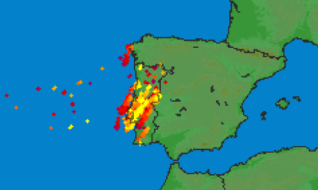 Portugal é o país da Europa que regista maior atividade elétrica na atmosfera neste momento, como demonstram as imagens de sites especializados consultados pelo 24Horas.