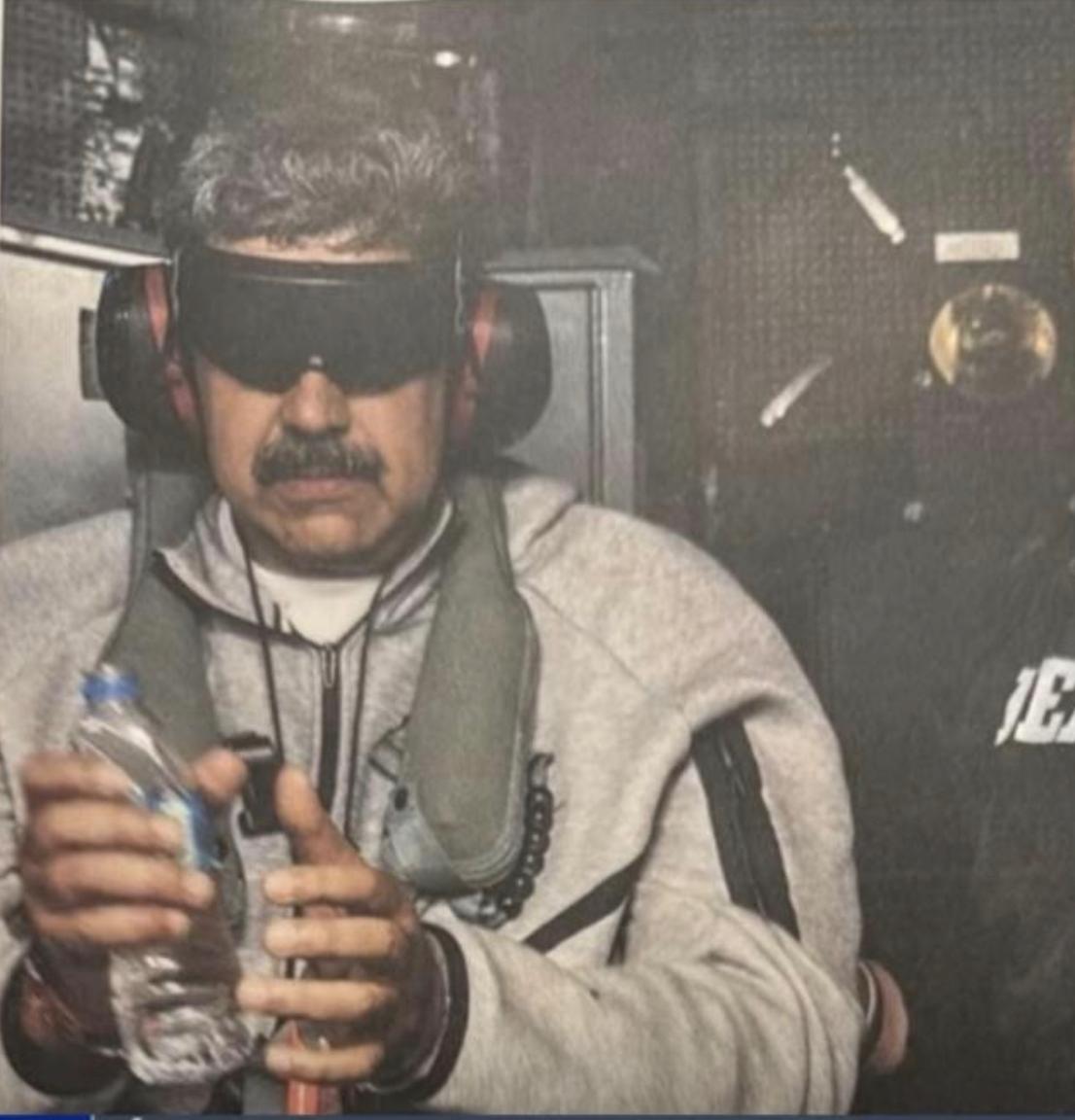 O até aqui presidente da Venezuela surge algemado, a segurar uma garrafa de água. Maduro aparece com óculos de sol, um supressor de ruído e veste um fato de treino cinzento da Nike. Segundo Trump, o líder venezuelano encontra-se a bordo do navio de guerra Iwo Jima.