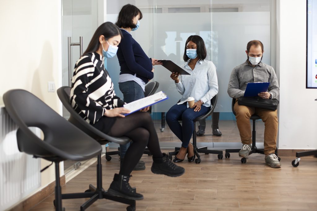 Black woman in face mask gets an opportunity offer from a pregnant recruiter. Multiethnic job seekers review applications as the expectant employer gathers cv resumes in office lobby.