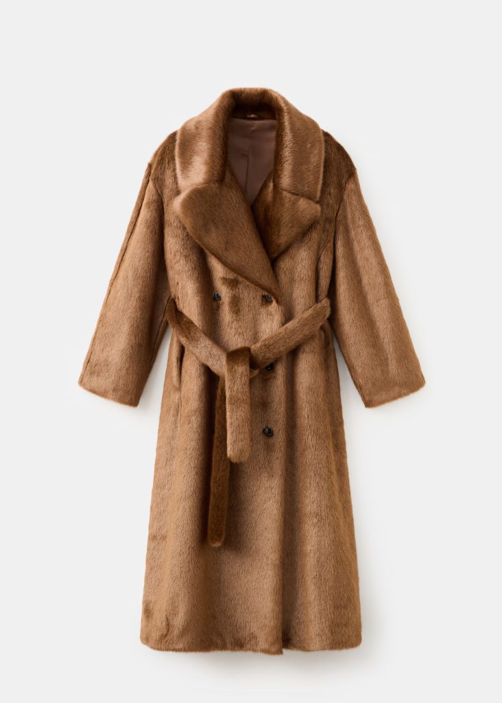 Com efeito de pelo e um design longo e direito, a peça destaca-se pela gola em V com lapela, cinto ao estilo dos roupões e fecho de abotoadura dupla. Conta ainda com forro interior, garantindo conforto nos dias mais frios. Para além da versão castanha, o modelo está também disponível em preto, ambas as cores são de venda exclusiva da loja online.