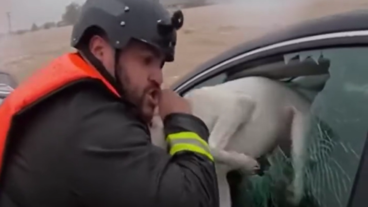 No vídeo em questão, é possível ver o amigo de quatro patas preso no interior de um carro, visivelmente assustado e em sofrimento. A viatura encontrava-se praticamente submersa na água, devido a uma forte tempestade, aumentando a cada segundo o risco de vida do animal.