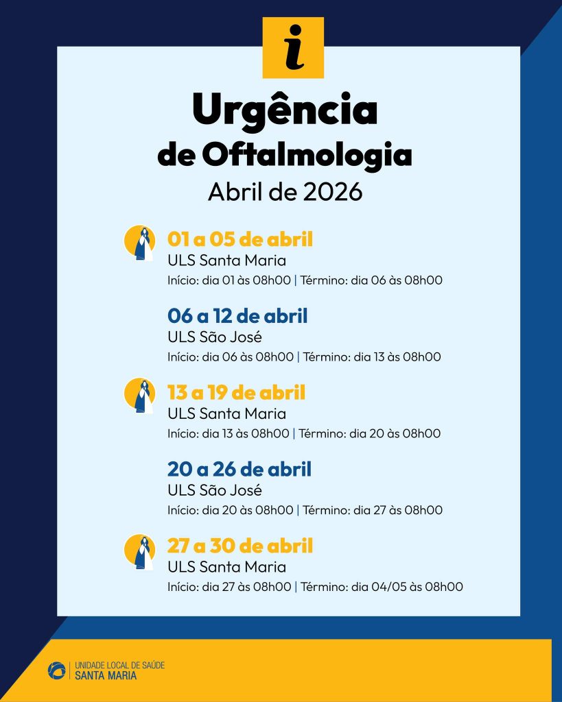 O Hospital Santa Maria divulgou o calendário de funcionamento da urgência de oftalmologia para o mês de abril, que será assegurada de forma rotativa entre o Hospital de Santa Maria e o Hospital de São José.