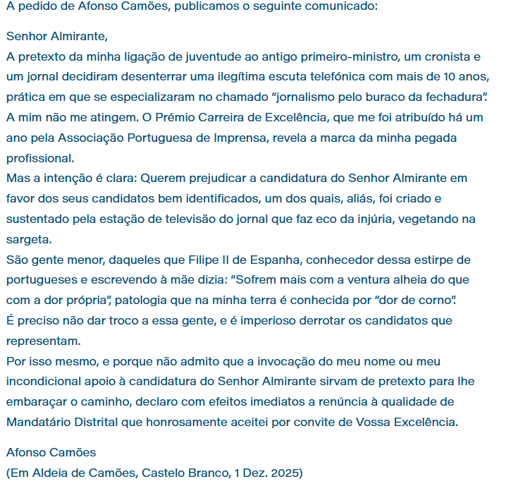 Afonso Camões renunciou ao cargo de mandatário distrital da candidatura presidencial de Gouveia e Melo, em Castelo Branco, decisão anunciada depois do Correio da Manhã ter divulgado uma peça que recuperava escutas telefónicas antigas envolvendo o ex-diretor do JN e o antigo primeiro-ministro socialista.