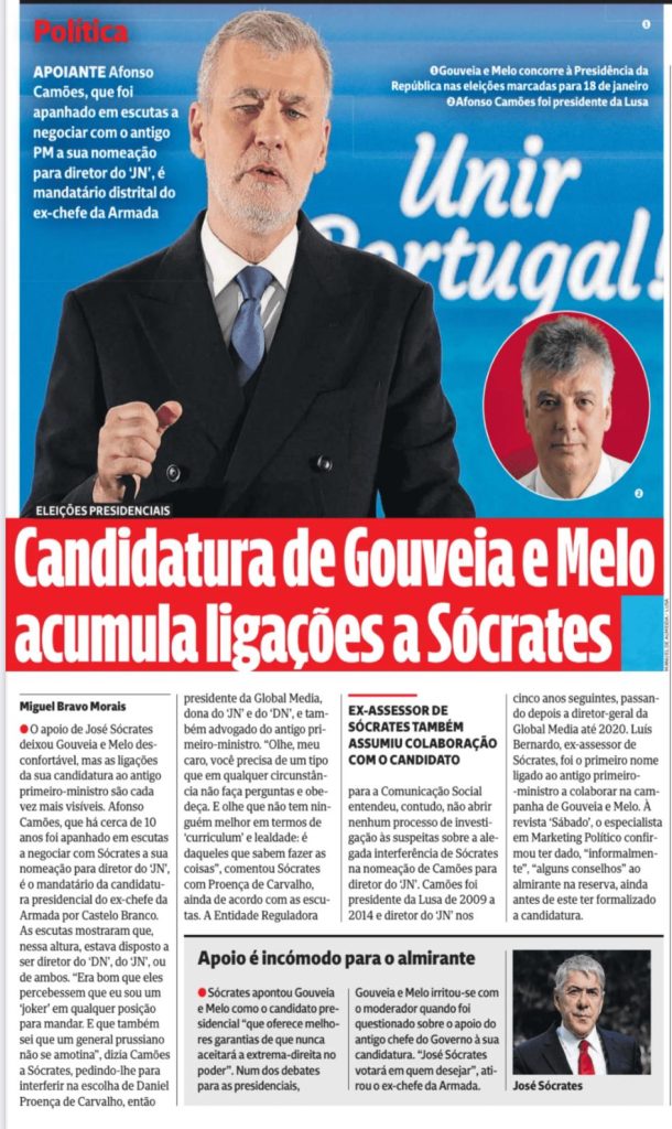 A notícia retomava conversas de há mais de uma década relativas à sua nomeação para cargos de direção no grupo Global Media, apresentando-as como indício de proximidade entre a candidatura do antigo chefe da Armada a Belém e figuras próximas de Sócrates. O tema gerou forte repercussão mediática e política, levando Camões a afastar-se para não criar constrangimentos adicionais.