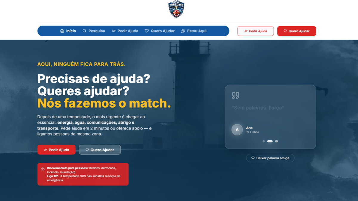 Com o lema “Um movimento de pessoas por pessoas. Aqui ninguém fica para trás”, a TempestadeSOS.com foi desenvolvida em menos de uma hora por uma equipa de voluntários com experiência nas áreas da Inteligência Artificial e da Comunicação, que decidiu agir de forma célere face à dimensão dos danos e ao rasto de destruição provocado pela tempestade.