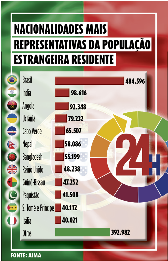 Os brasileiros continuam a ser a comunidade estrangeira mais numerosa, com 484.596 habitantes, como pode ver no nosso quadro. Destaque para os indianos, que subiram muitos lugares e são já a segunda nacionalidade com mais representatividade em Portugal, com 98.616. Seguem-se Angola (92.348), Ucrânia (79.232), Cabo Verde (65.507), Nepal (58.086) e Bangladesh (55.199), confirmando o aumento exponencial da imigração asiática.