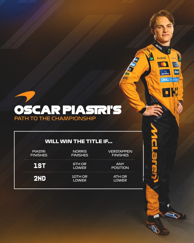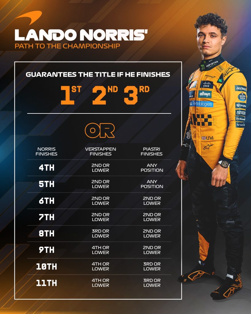 Norris lidera o campeonato com uma vantagem de 12 pontos em relação a Verstappen e de 16 em relação a Piastri, o que significa que o britânico apenas precisa de chegar em terceiro lugar para garantir o seu primeiro título de campeão de F1.