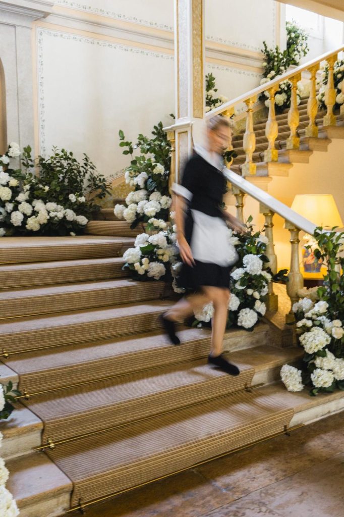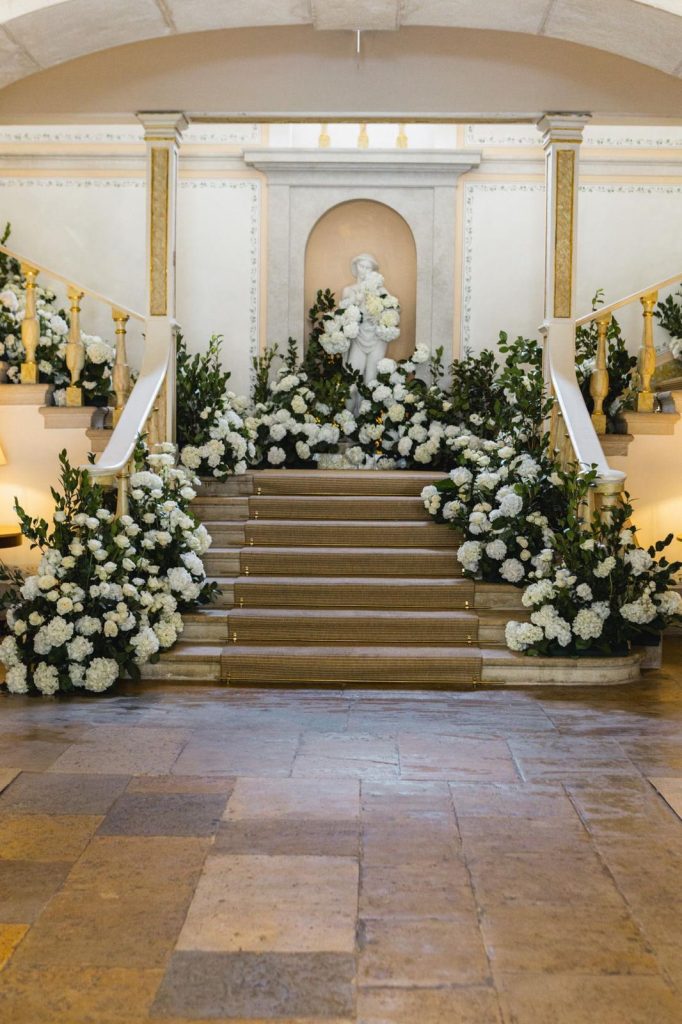 Até há data não se conhece a identidade dos noivos, apenas se vislumbra quem poderão ser graças ao monograma bordado a azul nos guardanapos de pano branco e também na passarela que percorreram para dizerem o sim. As flores usadas, mais de 5000, para a decoração de todos os espaços vieram de Itália, Espanha, Luxemburgo e Holanda, e para montar todos os arranjos a equipa da empresa portuguesa Decofloralia precisou de 5 dias, e 5 noites, de trabalho.