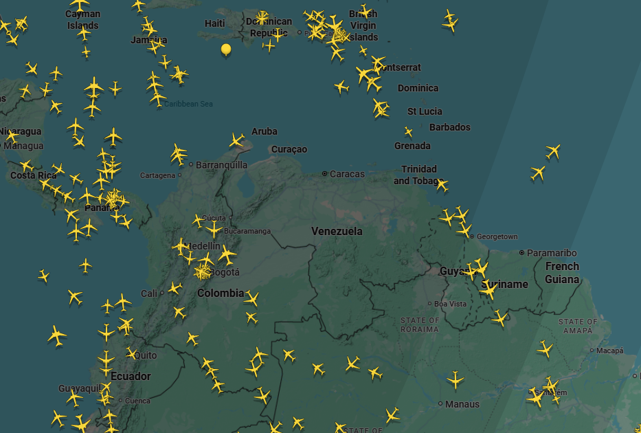 No `site` de rastreamento de voos Flightradar, poucos aviões aparecem sobre o território venezuelano, contrastando com a atividade sobre os países vizinhos.