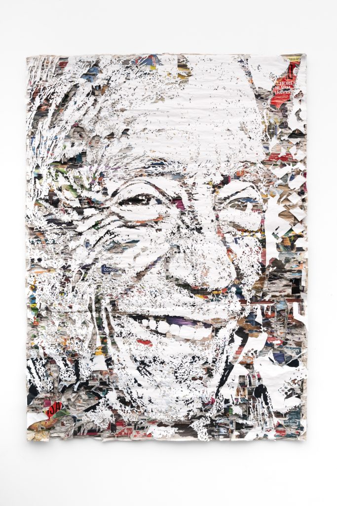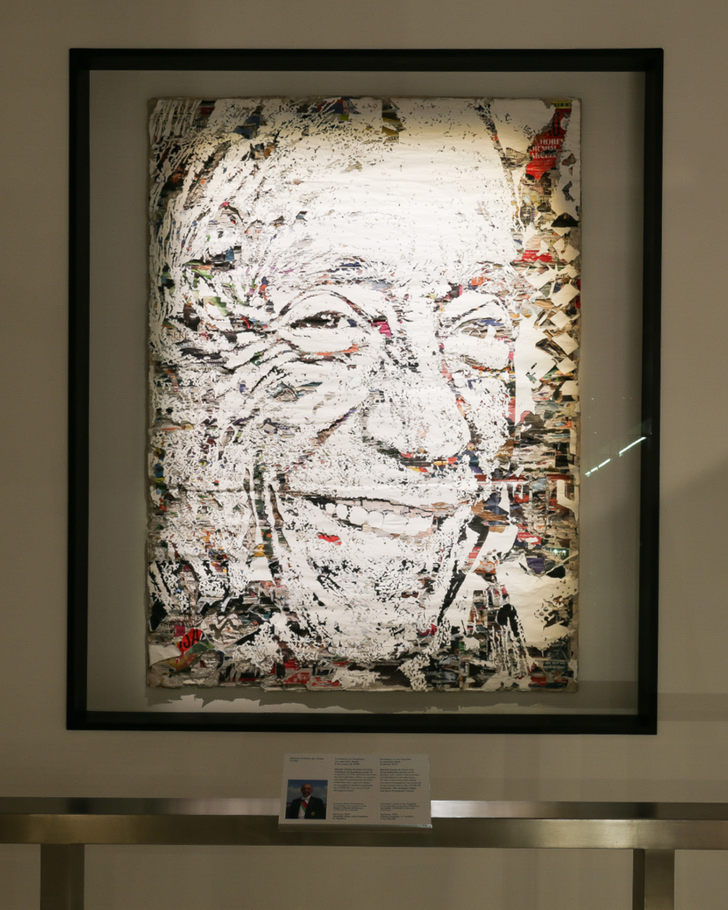 O retrato foi concebido a partir de jornais nacionais com notícias marcantes dos últimos dez anos, sobrepostos e trabalhados manualmente até revelar a imagem do próprio Marcelo Rebelo de Sousa.