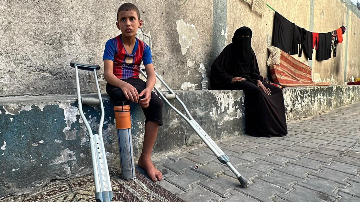 Saleb, de 9 anos, perdeu a mãe e parte da perna direita, num bombardeamento na Faixa de Gaza, enquanto se deslocava para um lugar descrito como seguro. Não desiste dos sonhos e um amigo ajudou-o a ‘construir’ uma perna de plástico para voltar a andar.