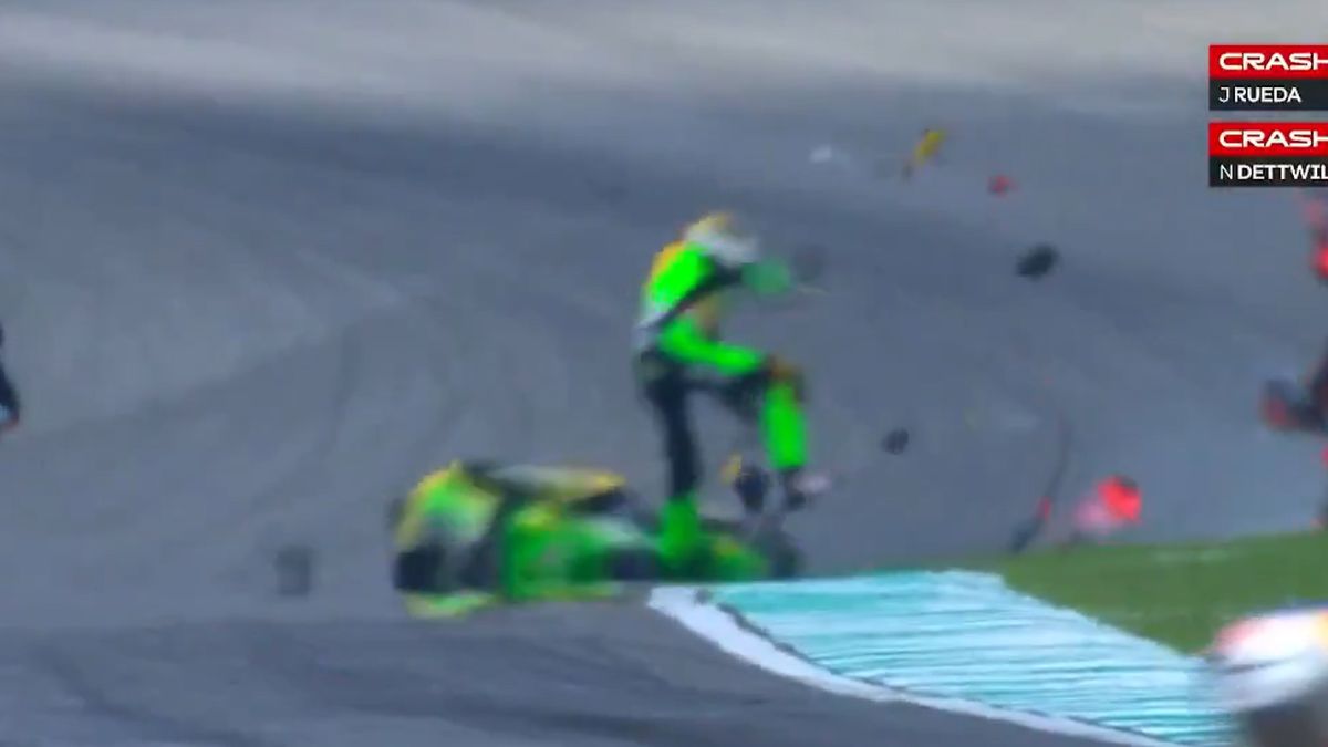 Foi ainda na fase de aquecimento quando o espanhol José António Rueda chocou com a traseira da moto do suíço Noah Dettwiler, numa altura em que os dois pilotos circulavam a velocidades muitos diferentes. Um embate brutal que desfez as duas motos e deixou os pilotos feridos no asfalto.